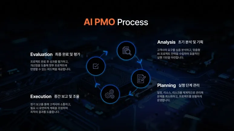 PMO(Project Management Office) 서비스는 프로젝트 일정, 리소스, 리스크를 종합적으로 관리하는 역할을 합니다. 특히 AI 프로젝트는 기술적인 복잡성과 행정적 절차가 함께 얽혀 있기 때문에, 전문적인 관리 없이는 성공하기 어렵습니다. 저희는 다수의 AI 프로젝트를 수행하며 얻은 경험을 바탕으로, 복잡한 문제 해결과 체계적인 관리의 중요성을 누구보다 잘 알고 있습니다.